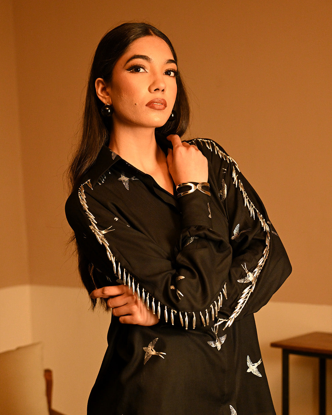 The shirt boasts a classic collared neckline, enhanced with a flap-covered button closure, ensuring a seamless and polished look. We've thoughtfully designed the tip-tap button opening with 1/2 inch distance between 2, eliminating the need for safety pins—giving you a hassle-free, secure fit without compromising on style. Silver dangling lace embellishments on the sleeves and pant side-seams add a playful yet elegant touch, as if giving wings to your outfit, making you feel alive, confident, and free-spirited.