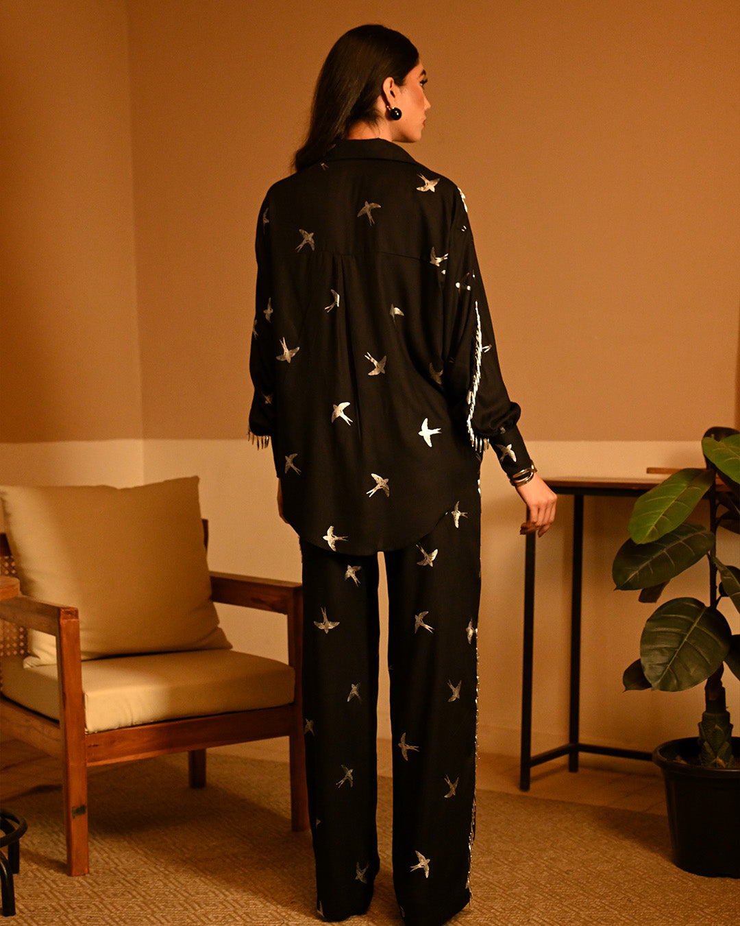 Embrace elegance and freedom with our Silver Bird Foil Shirt Set, a stunning blend of comfort and sophistication. This effortlessly stylish ensemble features a flowy loose-fit shirt paired with chic pants, both adorned with a mesmerizing silver bird foil print—a symbol of grace, confidence, and liberation. Like moonlight reflecting on water, this rayon fabric flows with a dreamy softness. The delicate foil print adds a touch of luxury, making the outfit shine with understated grace.