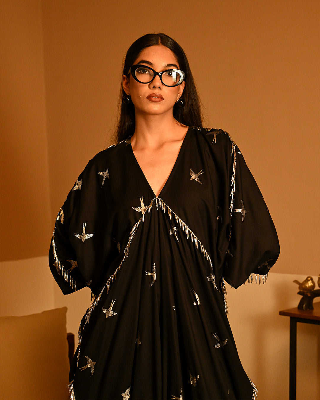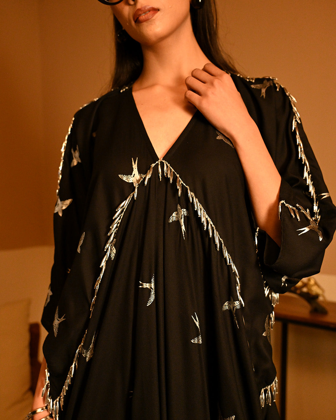 Embrace effortless elegance with Silver Foil Raglan Kaftan—a masterpiece of style, comfort, and charm.