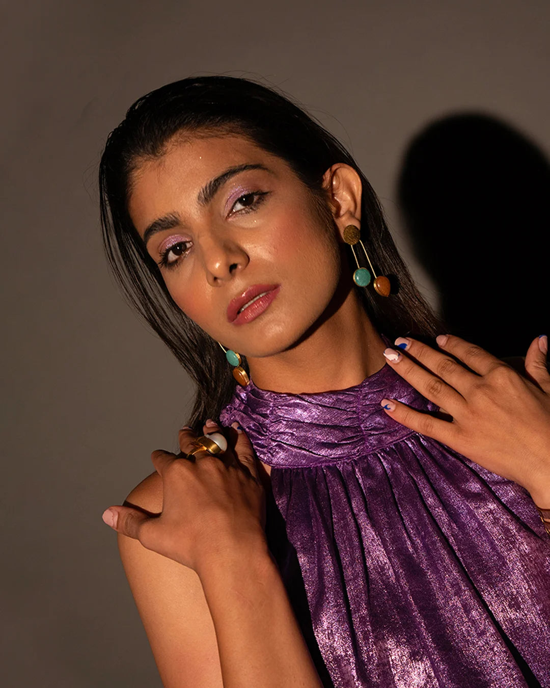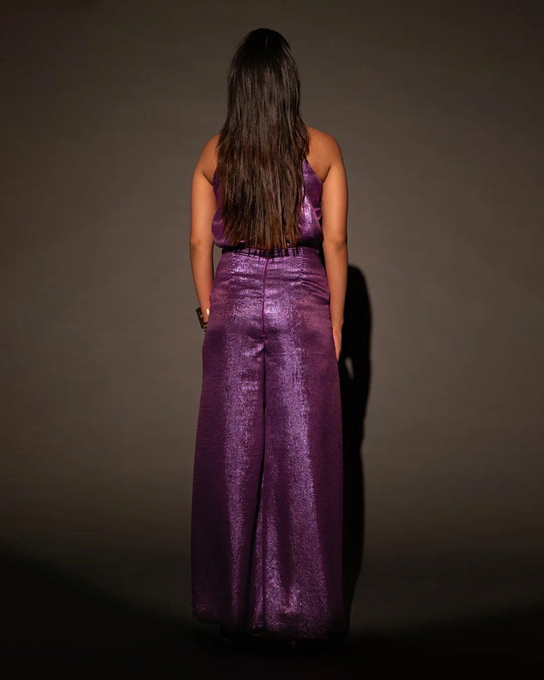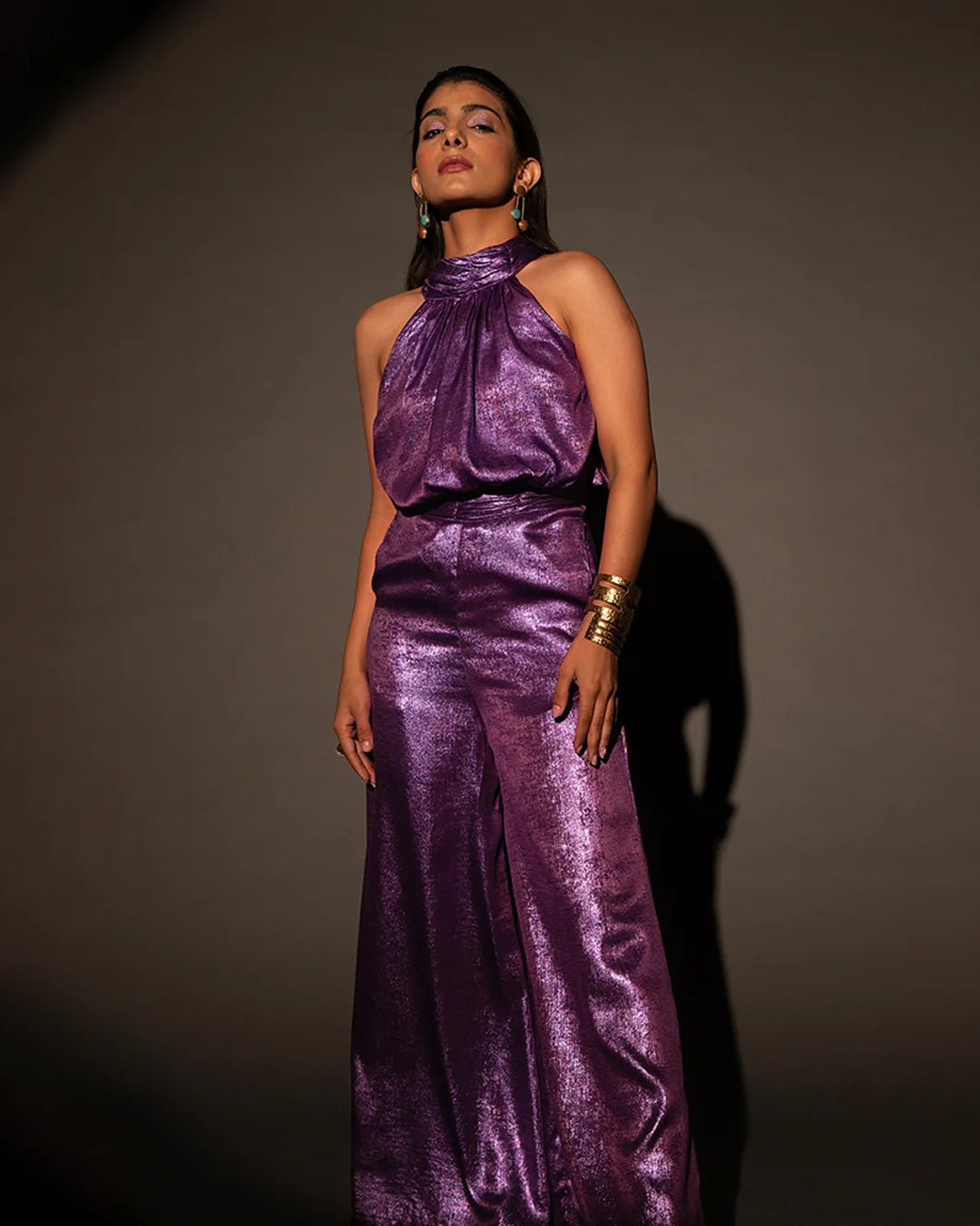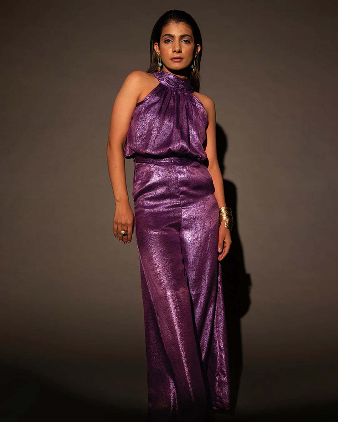 This is the luxury jumpsuit, crafted with purple luxury shimmer fabric. It has a halter neck and is sleeveless. The dress is fitted at the waist and is straight-legged.