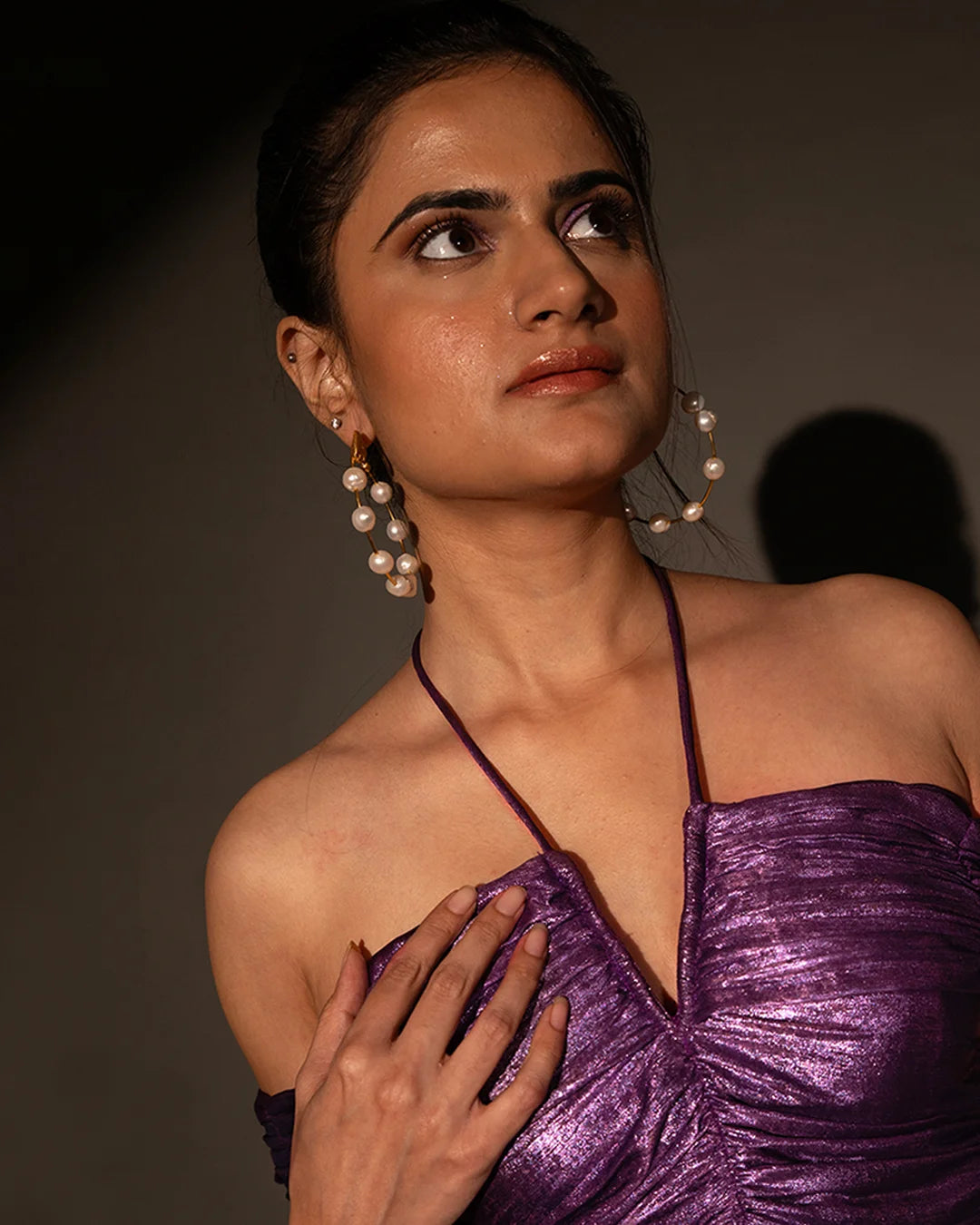 Introducing the epitome of modern elegance: our Purple luxury Shimmer Halter Neck Pleated Dress. This extraordinary dress is designed to make you feel like the belle of the ball, and here's why it deserves a special place in your wardrobe: