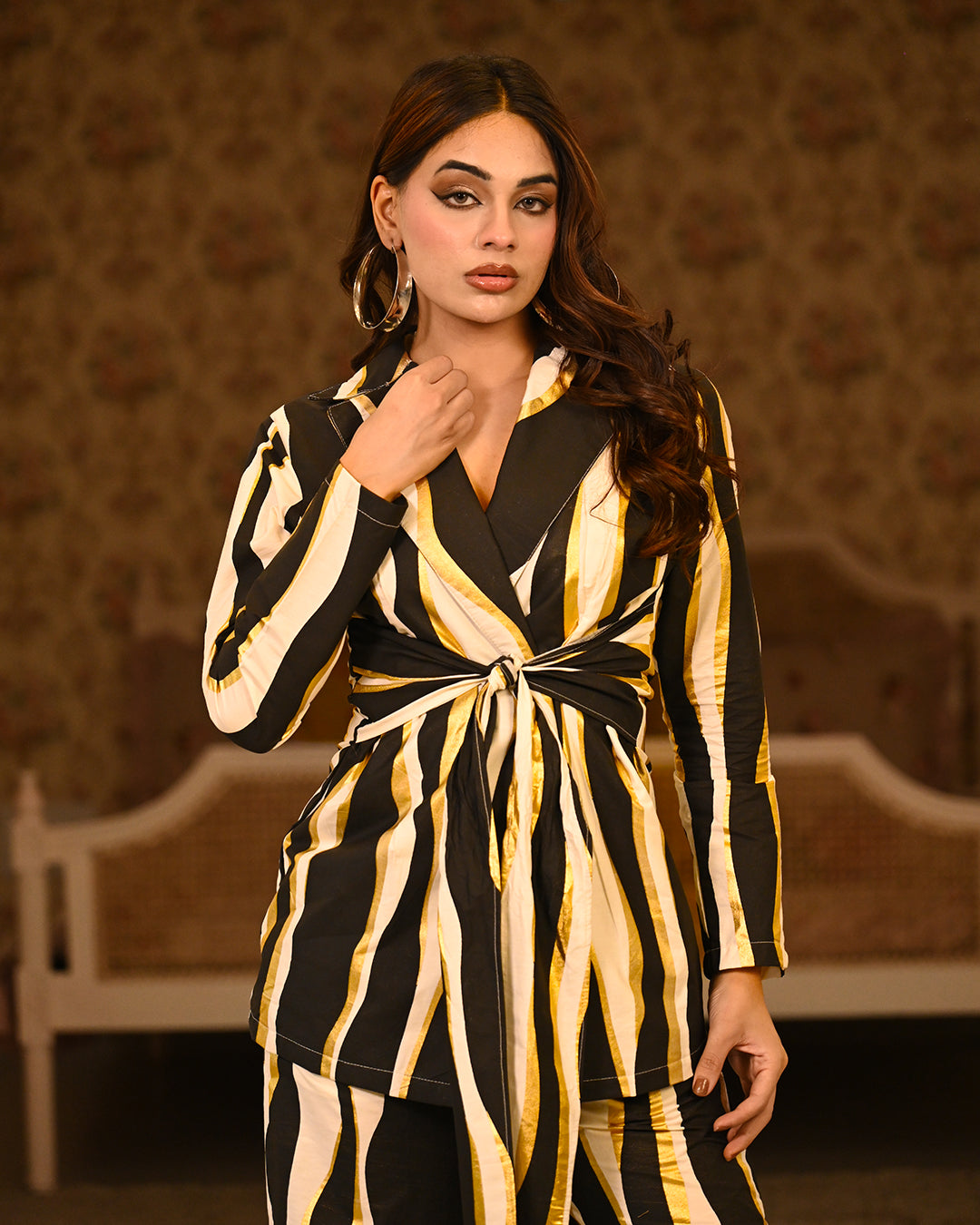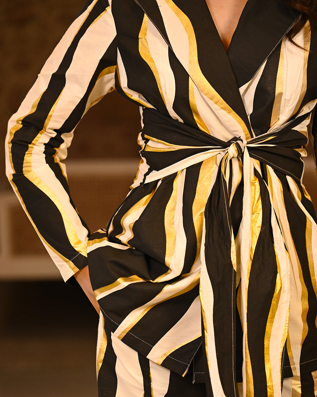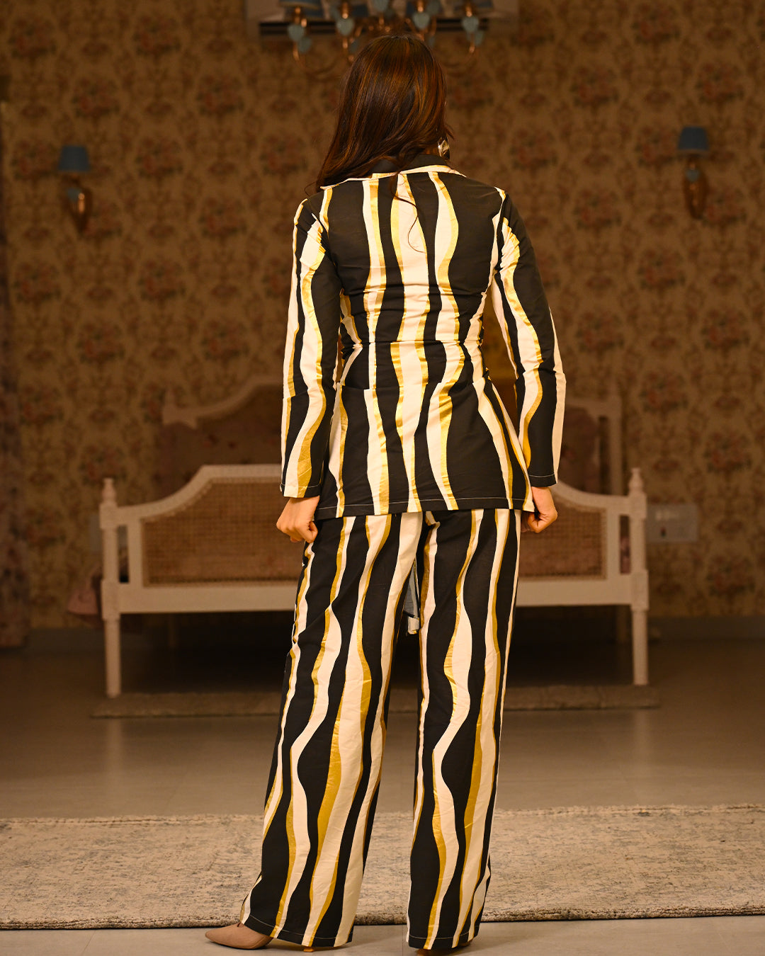 Crafted in breathable cotton poplin, this white capsule blazer set brings together crisp summer comfort and modern design. The fabric features abstract stripe prints finished with subtle gold foil touches, creating a look that feels both artistic and refined for events or elevated day outings. The tailored blazer can be styled effortlessly with different bottoms, making it a versatile wardrobe essential. The coordinating pants come with functional pockets and pair beautifully with almost any top in your wardrobe, making the set endlessly adaptable and easy to style in multiple ways.