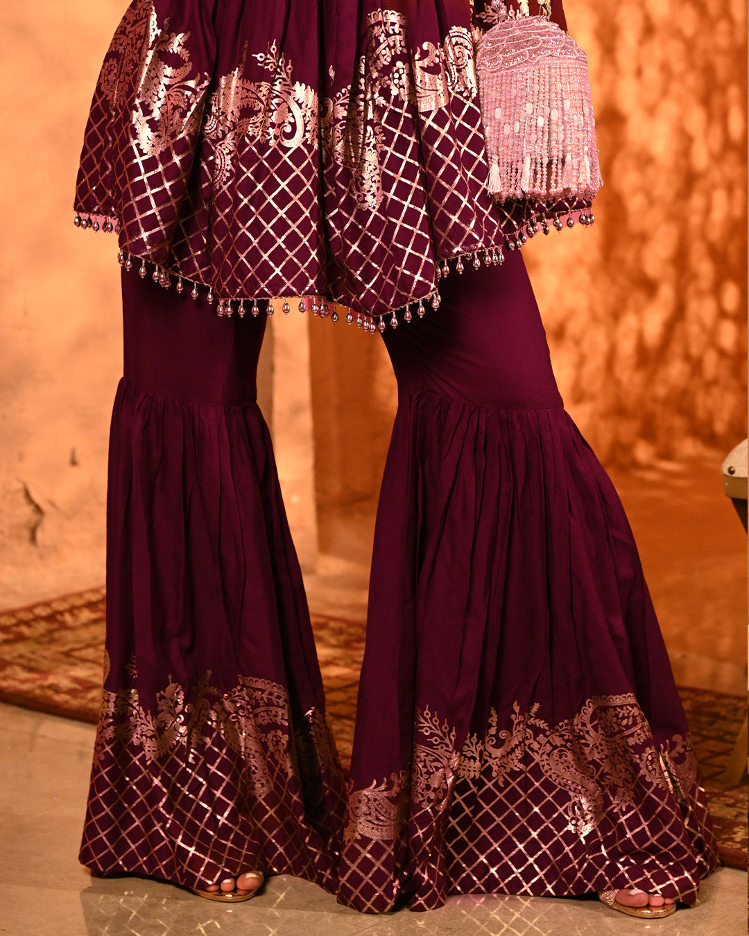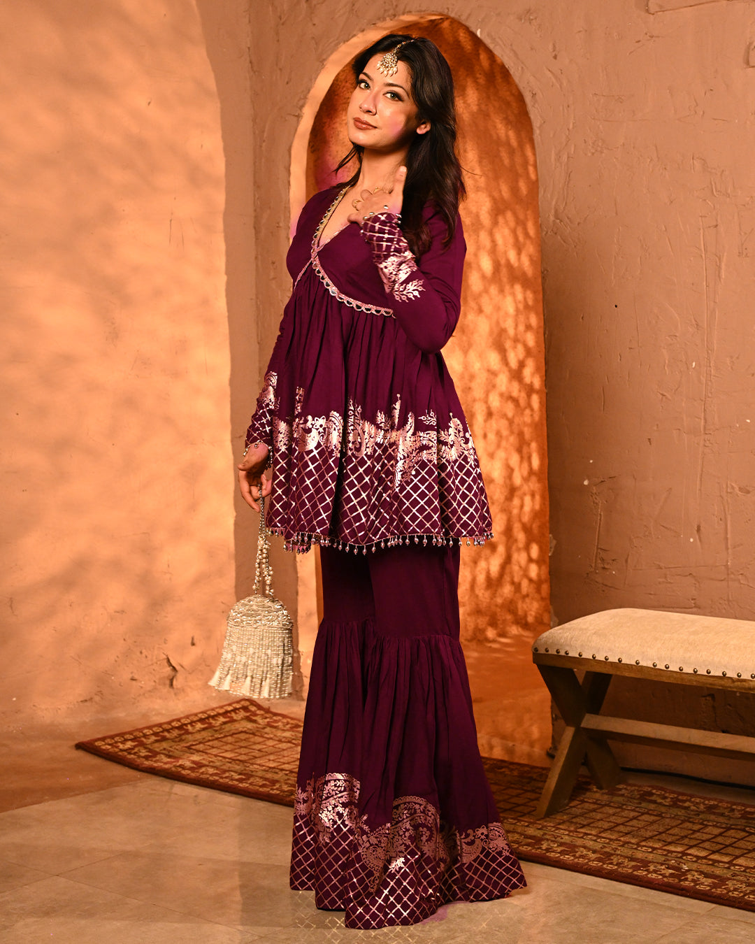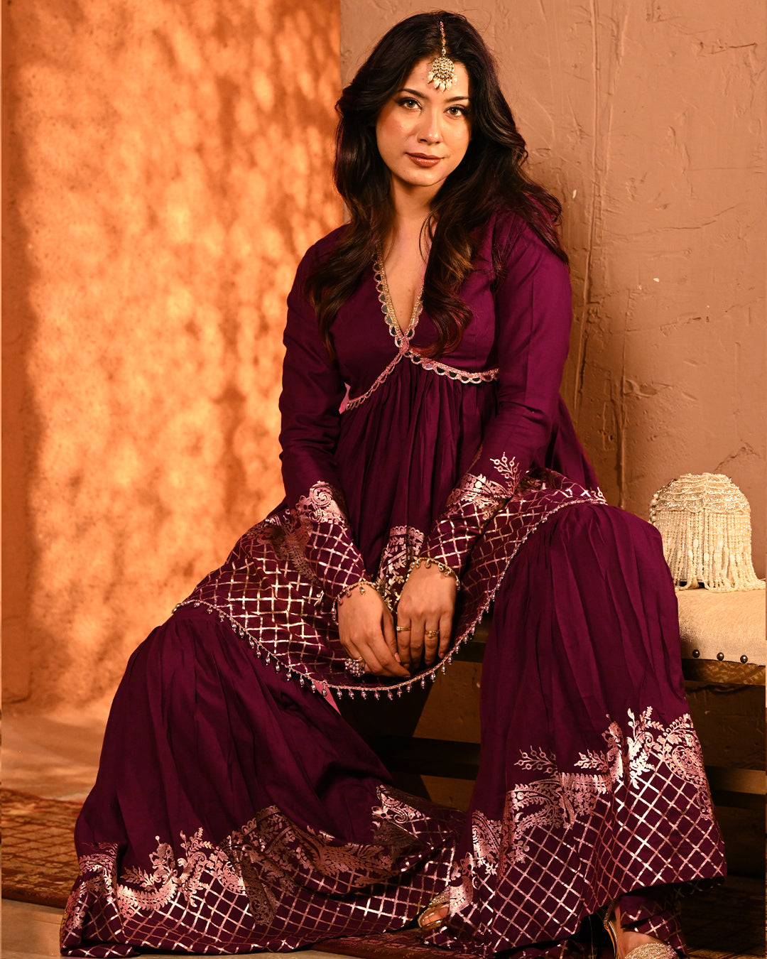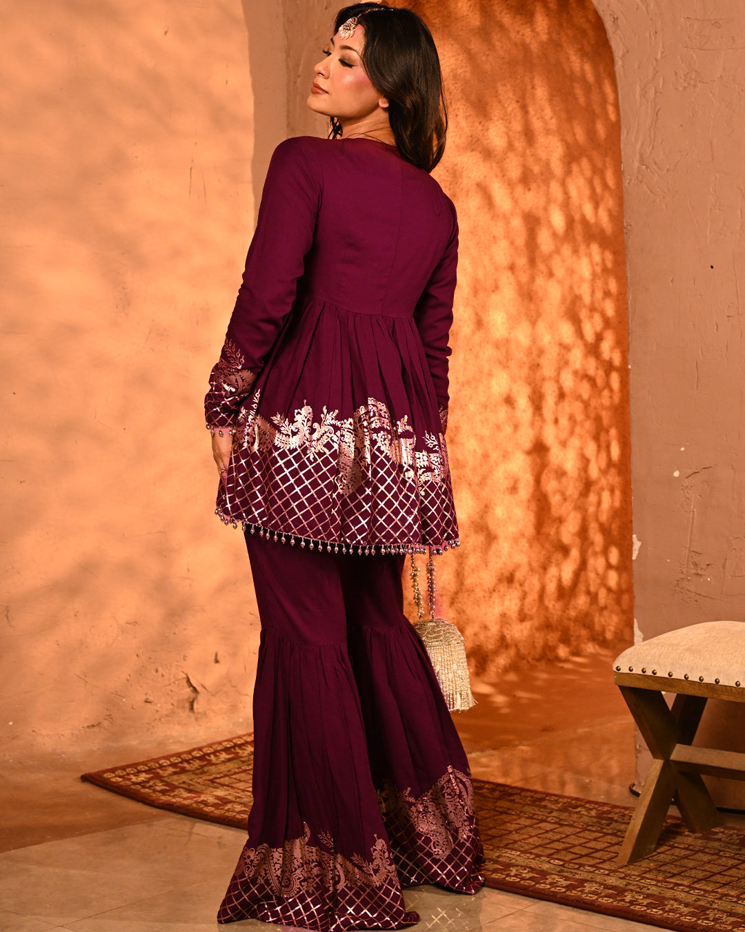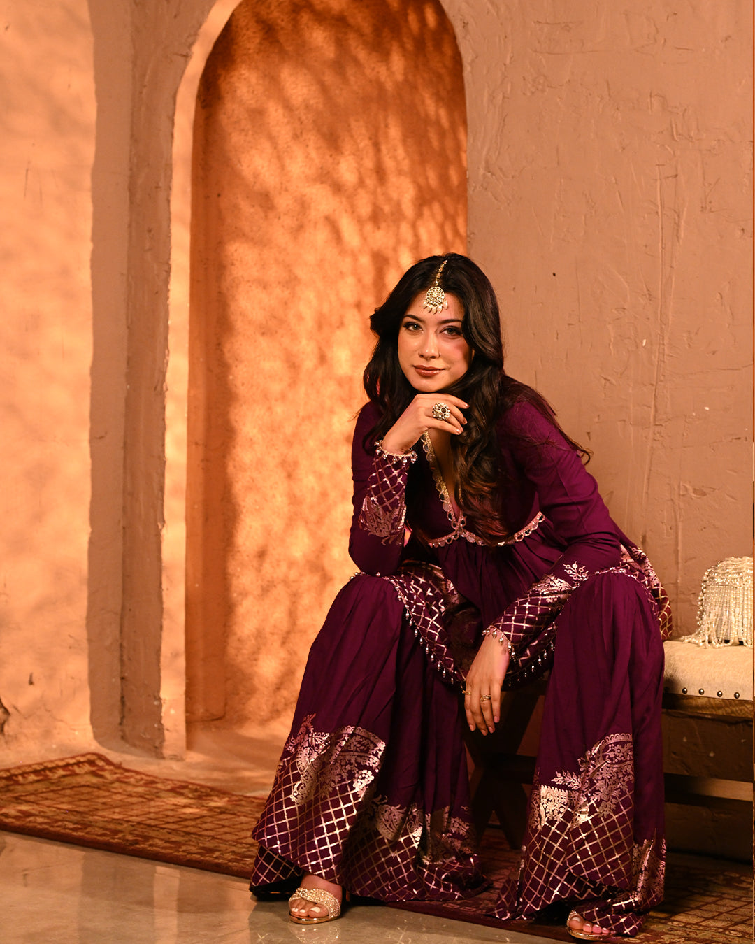 A timeless classic with a festive twist — the Black Aliyah Sharara Set is crafted to turn heads with its graceful silhouette and intricate detailing. The top features a flattering V-neckline and a peplum-style flare that begins just below the bust, accentuating the waist and creating a fluid, feminine shape. The sleeves follow the same fitted-to-flared structure, lending an elegant rhythm to the ensemble.A timeless classic with a festive twist — the Black Aliyah Sharara Set is crafted to turn heads with its graceful silhouette and intricate detailing. The top features a flattering V-neckline and a peplum-style flare that begins just below the bust, accentuating the waist and creating a fluid, feminine shape. The sleeves follow the same fitted-to-flared structure, lending an elegant rhythm to the ensemble.